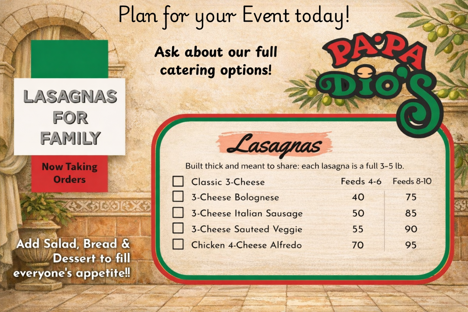 Sign up for email and text notifications to find out about special, events, and all the goings on at Papa Dio’s!